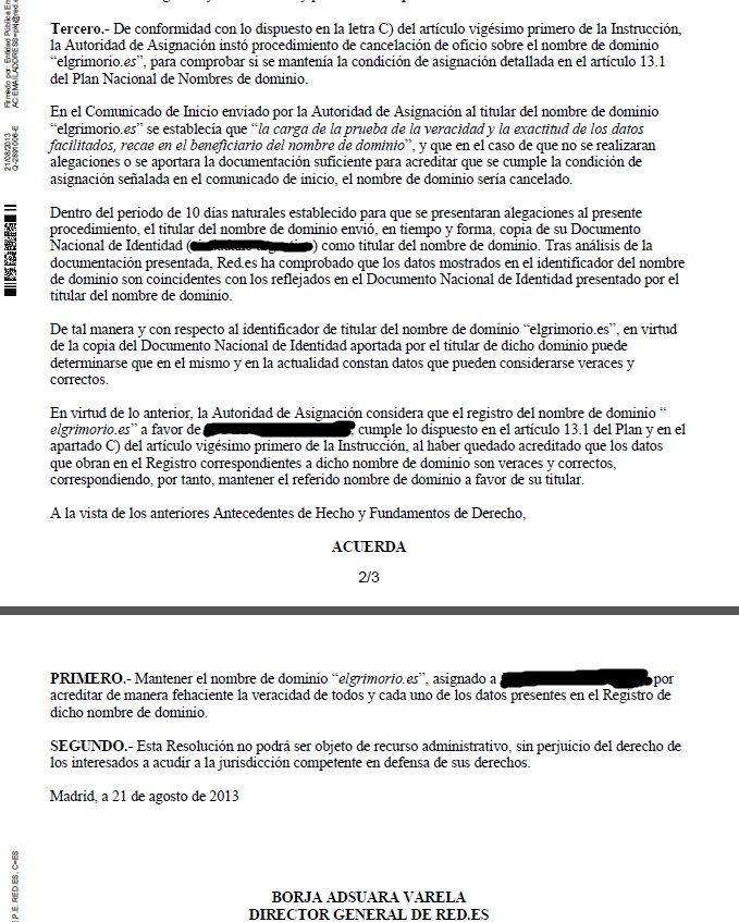 En el ultimo mes, han estado intentando cerrar el blog, con una denuncia a nic.es sobre la falsedad de los datos del titular. Mas alla de que cualquier resolucion que “prospere” no va a dar de baja el blog ya que lo tengo backupeado y solo tendria que cambiarle el dominio, les comento ya que parece que no tienen nada mas productivo para hacer que denunciar, denunciar y denunciar (como denuncian los links de descarga) les muestro como ni siquiera nic.es les da la razon.